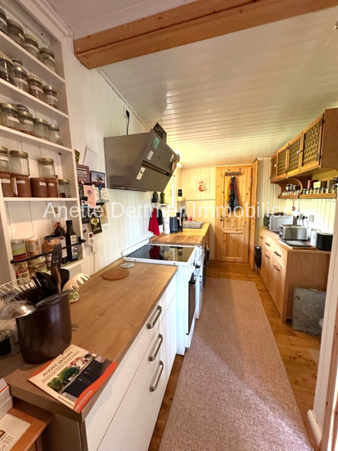 Die Fassade aus Lärchenholz mit neuen Fensterläden und zwei Rollläden unterstreicht den natürlichen Charakter des Hauses, während die Smarthome-Ausstattung modernen Wohnansprüchen gerecht wird. Die Küche ist mit einem Induktionsherd und einer hochwertigen Dunstabzugshaube ausgestattet.